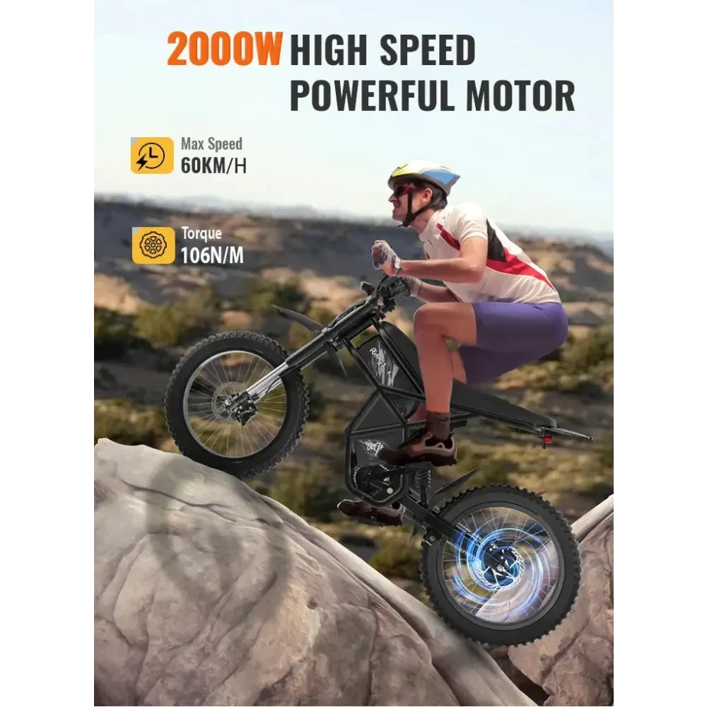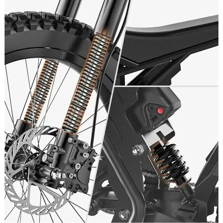 🔥 Key Features Unmatched Power & Speed • Central Brushless Motor delivers instant torque and smooth acceleration • Top Speed: 100 km/h — serious performance for off‑road riders • Torque: 500 Nm for steep climbs and aggressive riding Dual‑Battery Endurance • Battery: 60V 36Ah (Dual Battery System) • Total Energy: 3240 Wh • Range: Up to 150 km per charge • Charging Time: 5–8 hours Built for Tough Terrain • Full Suspension System absorbs jumps, bumps, and rough trails • Aluminum Alloy Frame — strong, lightweight, corrosion‑resistant • Tire Size: 70/100‑19 for dirt‑bike‑level traction and stability Ride With Confidence • Hydraulic Disc Brakes with power‑cut safety • 5‑Speed Assist System for customizable riding • Waterproof Design for all‑weather performance Universal Compatibility • Plug options: US / EU / UK • Designed for adult riders • Ideal for off‑road, mountain, and adventure riding