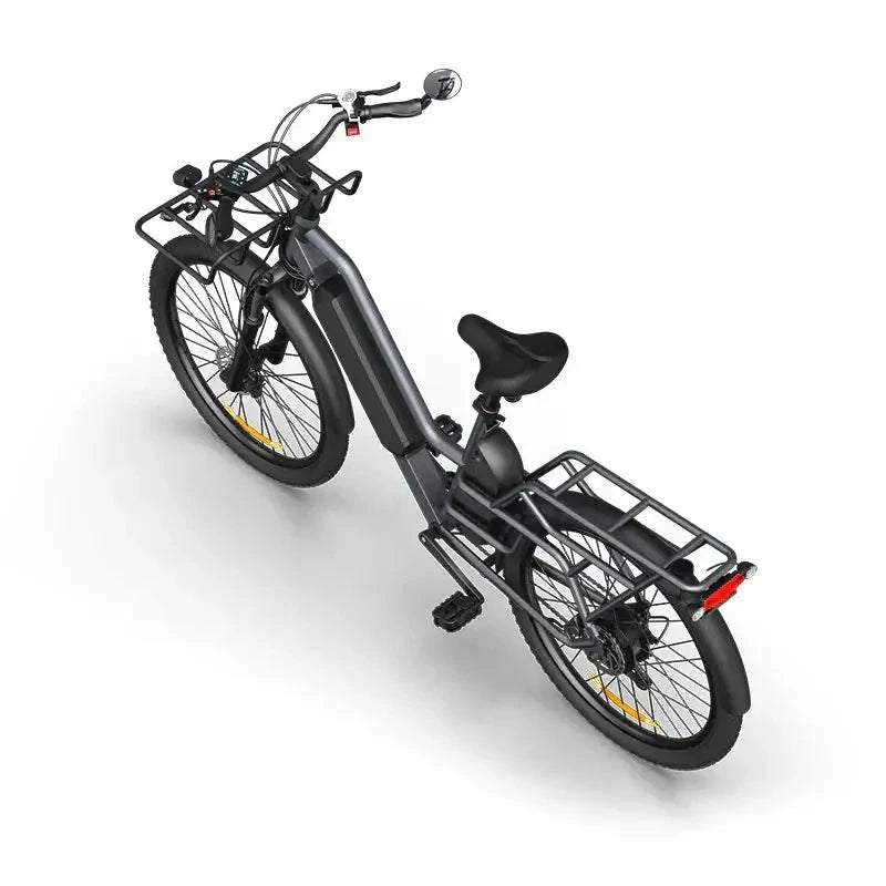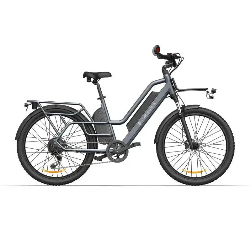 This A DECE OASIS electric bicycle delivers a powerful and versatile riding experience. The robust charcoal grey frame showcases a convenient step-through design, ensuring effortless mounting and dismounting for riders. An integrated battery system discreetly powers the electric assist, offering reliable performance for all your commutes and adventures.