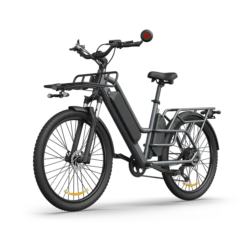 This utility e-bike includes sturdy front and rear cargo racks, providing ample space for carrying groceries, packages, or essential gear. Full-coverage fenders on both wheels ensure a clean and dry ride in various weather conditions. Enjoy exceptional comfort with the front suspension fork, absorbing bumps and delivering smooth handling across diverse terrains. Integrated headlights and taillights actively illuminate your path and enhance visibility, ensuring safe riding day or night.