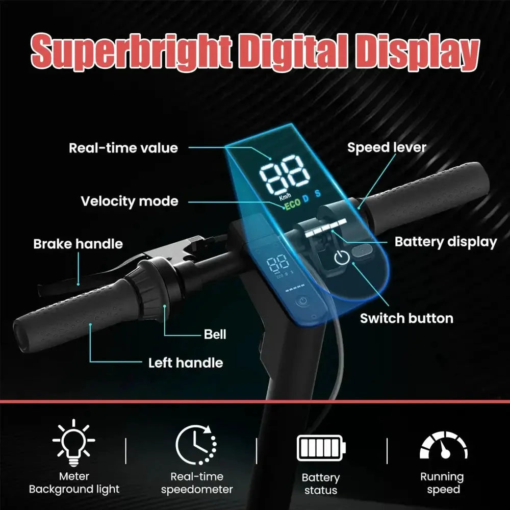 Enjoy the thrill of fast acceleration and smooth control, thanks to advanced suspension and precision wheels designed for both stability and fun. The intuitive digital display keeps you informed, while integrated LED lights enhance your safety on every journey. With an impressive range and quick recharge, the Hezzo G30 is your ticket to premium, eco-friendly mobility.