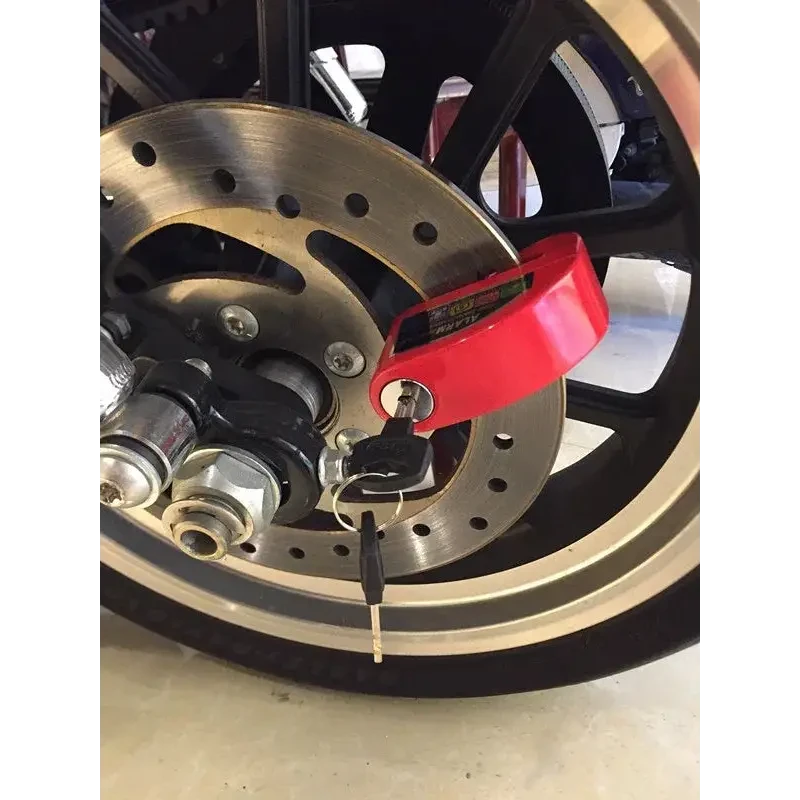 This robust security device features a striking red finish, ensuring high visibility. It securely attaches to the disc brake system of motorcycles and scooters, preventing unwanted movement and unauthorized use. An integrated alarm system provides an audible deterrent against theft attempts, activating upon tampering. The unit operates with a reliable key mechanism, providing straightforward operation. A set of keys is included for immediate use and convenience. Its durable construction delivers superior protection, making it an essential anti-theft accessory for safeguarding your valuable vehicle. This heavy-duty lock offers enhanced motorcycle security.
