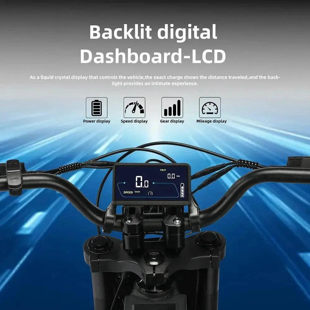 Unleash your adventurous spirit with our electric dirt bike 1500W for adults. Engineered for performance and durability, this high-powered electric dirt bike is ideal for those seeking excitement in rugged terrains. With its robust 60V power system and lightweight alloy frame, you'll conquer hills and trails with ease while enjoying an eco-friendly ride.