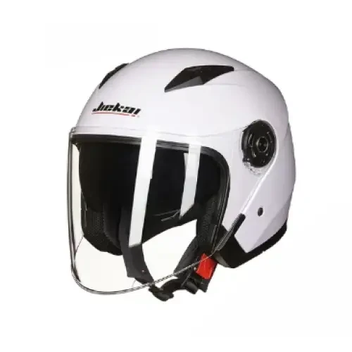 This sleek white open-face motorcycle helmet delivers optimal protection and style for urban and touring riders. The glossy finish enhances its modern aesthetic. It features a durable, clear, anti-scratch visor providing wide visibility and protection from wind and debris. Integrated top ventilation ensures comfortable airflow during rides. The Jiekkai brand, model JSN, guarantees quality and performance. This helmet complies with ECE safety standards, confirming its protective capabilities. A convenient quick-release buckle on the chin strap secures a snug and comfortable fit. This premium helmet is perfect for motorcycle enthusiasts and scooter riders seeking reliable head protection.