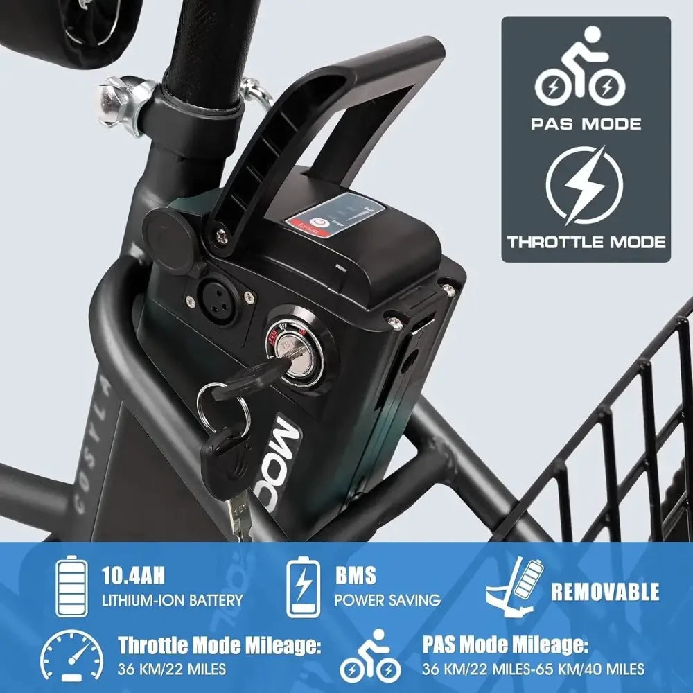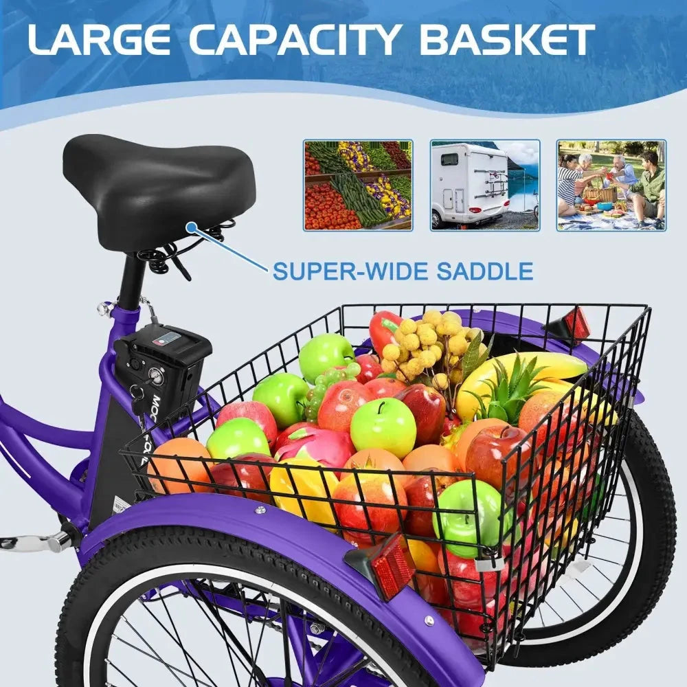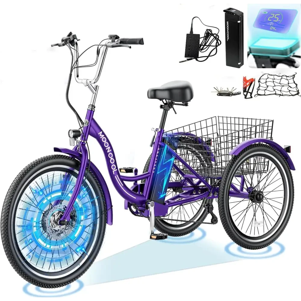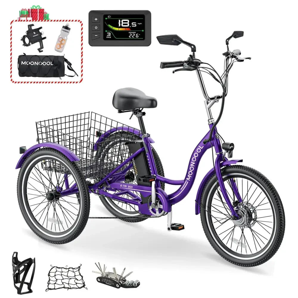 MOONCOOL Electric Tricycle has three driving modes: electric & power assist & pedal. The different options electric trike will make you enjoy riding and exercising. The electric vehicle is equipped with a 350w motor, with a maximum speed of 15.5 mph. The detachable 36V 10.4Ah lithium battery can be fully charged within 6-8 hours. The electric tricycle bike's pure electric range is about 22-40 miles. The battery and bike are shipped separately, so you will receive two packages. The total vehicle weight of cruiser electric tricycle is about 81lbs, which suitable for 4'11'' to 5'11'' height and 350lbs weight.The 3 wheel electric bicycle is 24 inch, and the basket of electric mountain tricycle is 13*17 inch. You will get a spacious space for pet cages or more types of cargo when you feld the integrated folding basket. And the seat of electric tricycle can be removed on proper position to meet your height.
