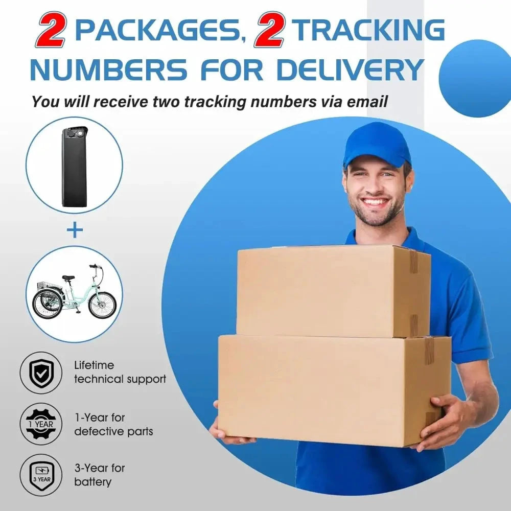【1 Year Manufacturer Guarantee】Please note that the product is delivered in two packages, the battery and trike are delivered separately, and the tricycle needs to be assembled. Adult electric trike comes with a one-year warranty on all defective or damaged parts. 30-day return & money back guarantee. We offer premium quality and the best service, no matter what reason cause dissatisfaction, we'll replace it or reimburse you every cent back!