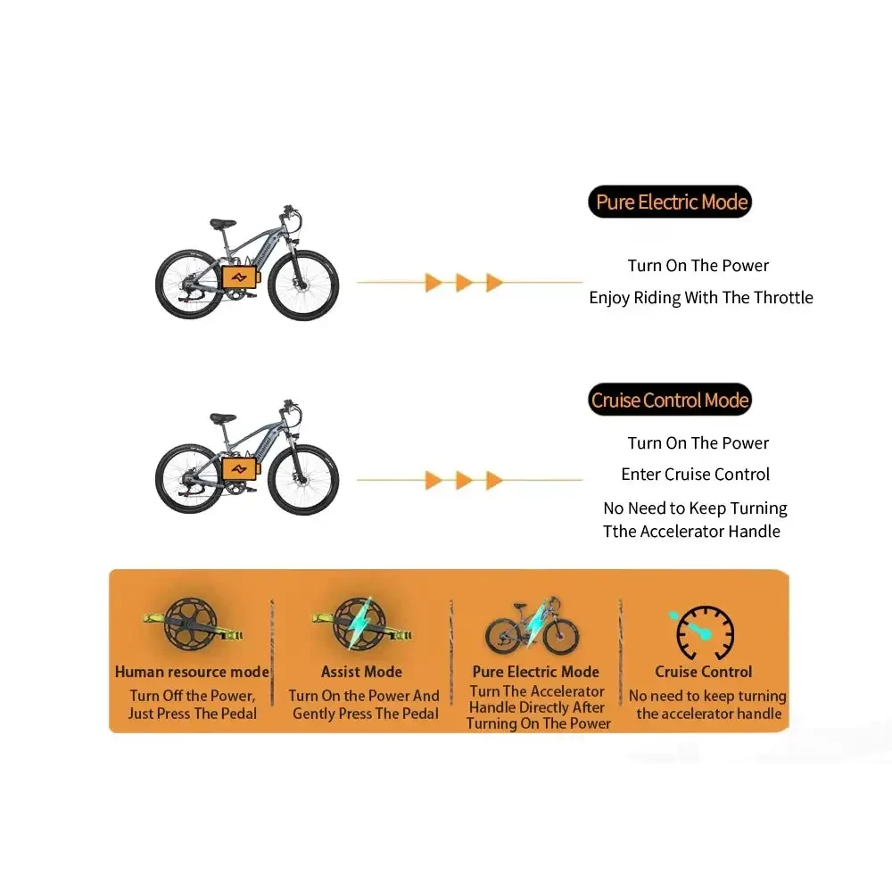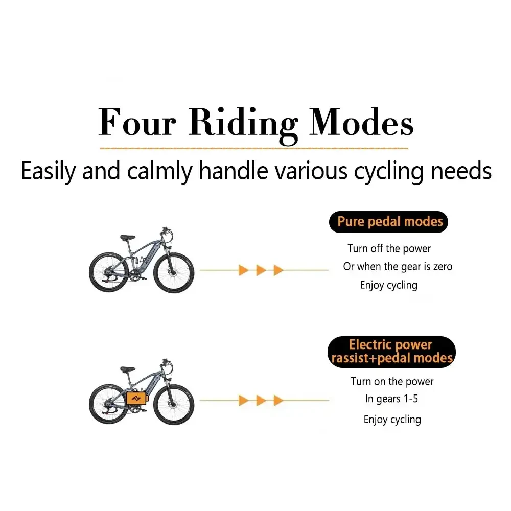 🌟 Why Riders Choose the SYR03 • High‑Speed Brushless Motor Smooth, powerful acceleration with wattage above 500W for confident climbing and cruising. • Hydraulic Oil Brake System Front and rear disc brakes deliver responsive, reliable stopping power in all conditions. • Long‑Range Lithium Battery Travel 60+ km per charge with a 48V power system designed for endurance. • Premium Aluminum Alloy Frame Lightweight, durable, and built for daily use. • Soft Tail Shock Absorption Ride comfortably on rough terrain with advanced rear suspension. • Color LCD Display Track speed, battery level, distance, and more with a bright, easy‑to‑read screen. • Massive 150–180 kg Load Capacity Built strong for riders who need stability and strength. • 27.5" × 2.4" Tires Wide, grippy, and ready for both city streets and off‑road adventures.