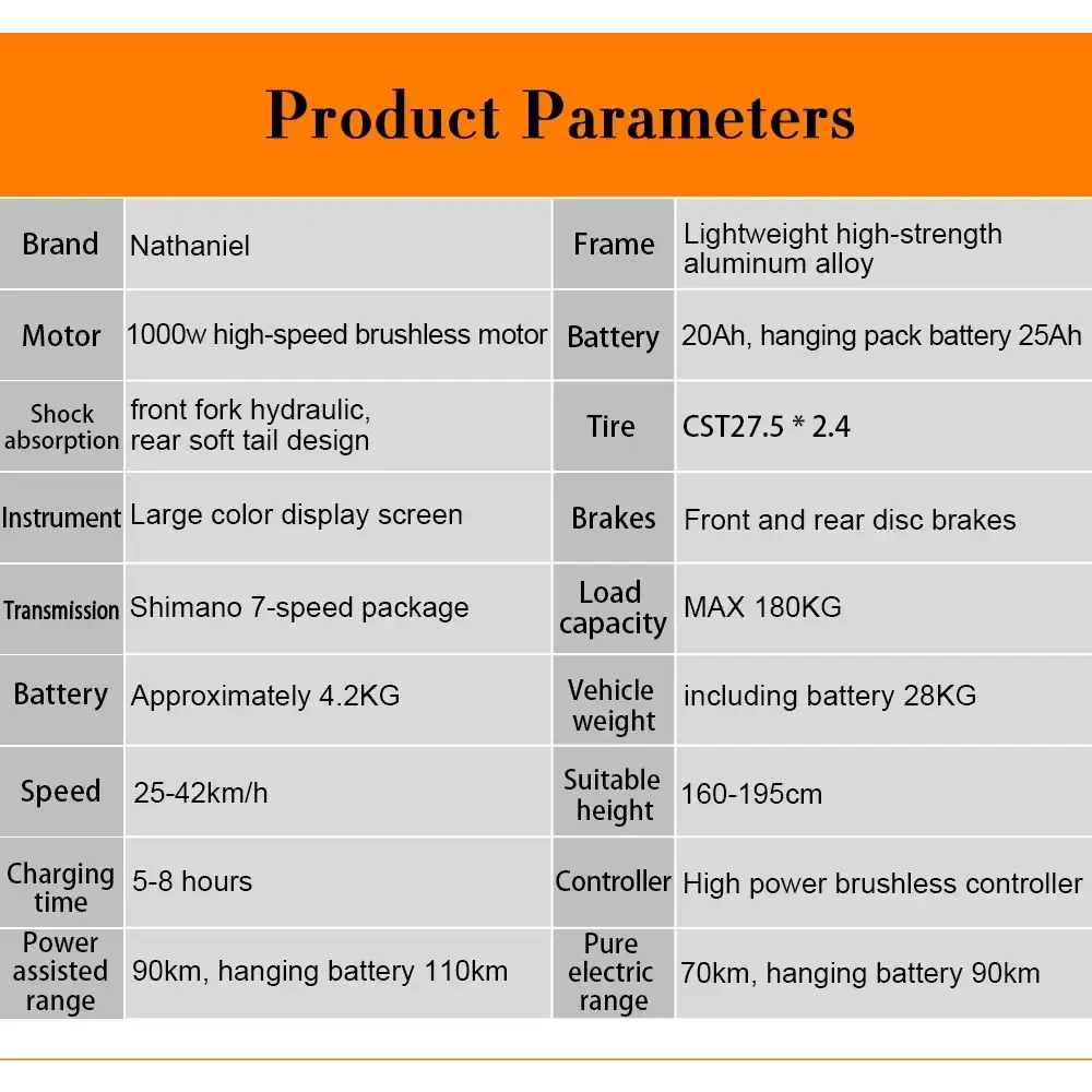 🚀 Nathaniel SYR03 — High‑Performance Multifunctional E‑Bike Power. Precision. Freedom. Every Ride. The Nathaniel SYR03 is engineered for riders who demand real performance — not just promises. With a high‑speed brushless motor, hydraulic oil brakes, and a rugged aluminum‑alloy frame, this e‑bike delivers the perfect balance of speed, safety, and long‑range capability. Whether you're commuting, exploring trails, or powering through weekend adventures, the SYR03 is built to elevate every moment on the road.
