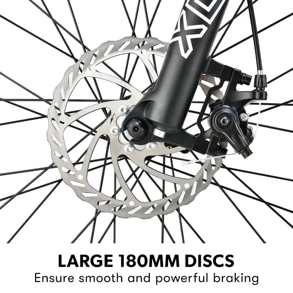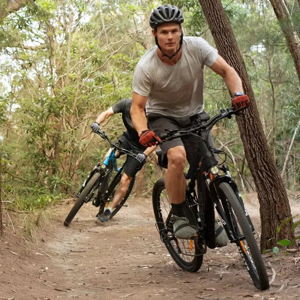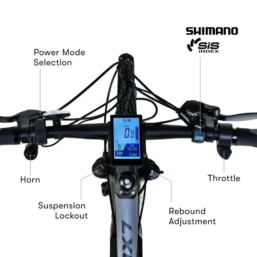 Experience superior control and performance with this feature-rich electric bicycle. A prominent digital display provides real-time data including speed, current time, trip distance, and battery level, keeping you informed on every journey. Seamlessly transition through seven gears using the reliable Shimano SIS Index shifter, ensuring optimal power delivery for varied terrain. Command your ride with the integrated throttle and precisely adjust your assistance level with the convenient power mode selection button. Safety is enhanced with an easily accessible horn. Customize your ride’s comfort and handling with the advanced suspension system, featuring both a lockout mechanism for efficient climbs and a rebound adjustment for smooth descents. This electric bike is designed for adventurous commuting, trail riding, and exploration, offering a powerful, comfortable, and responsive cycling experience. Enjoy a high-performance electric mountain bike with precise handling and robust construction.
