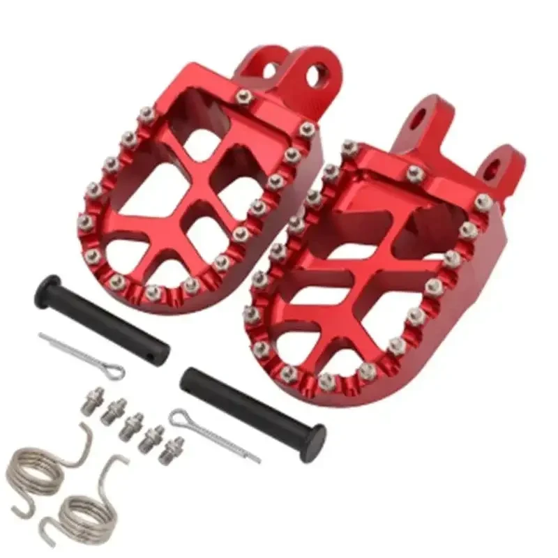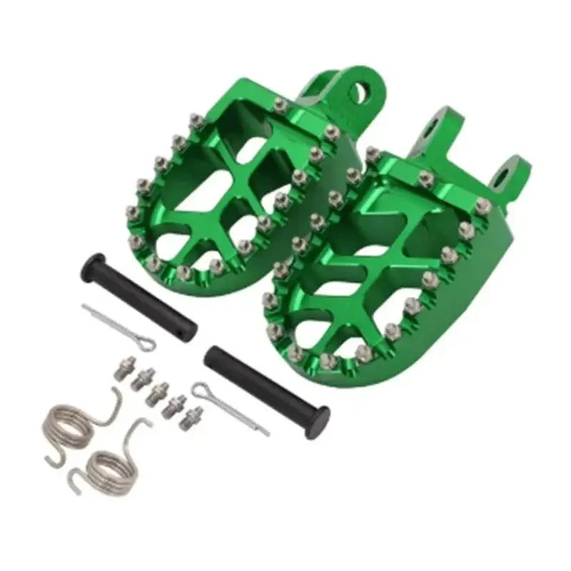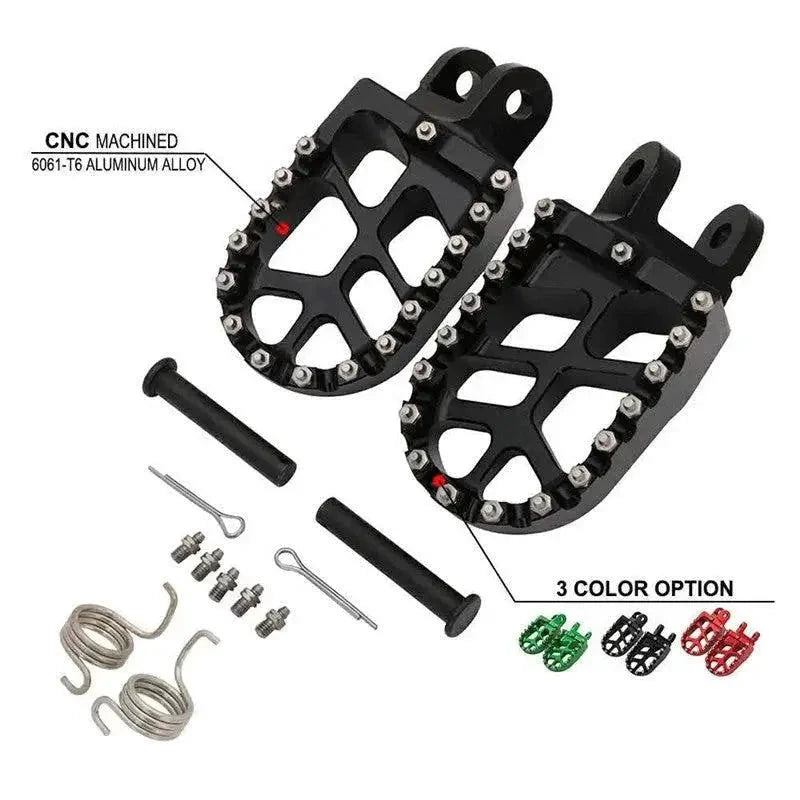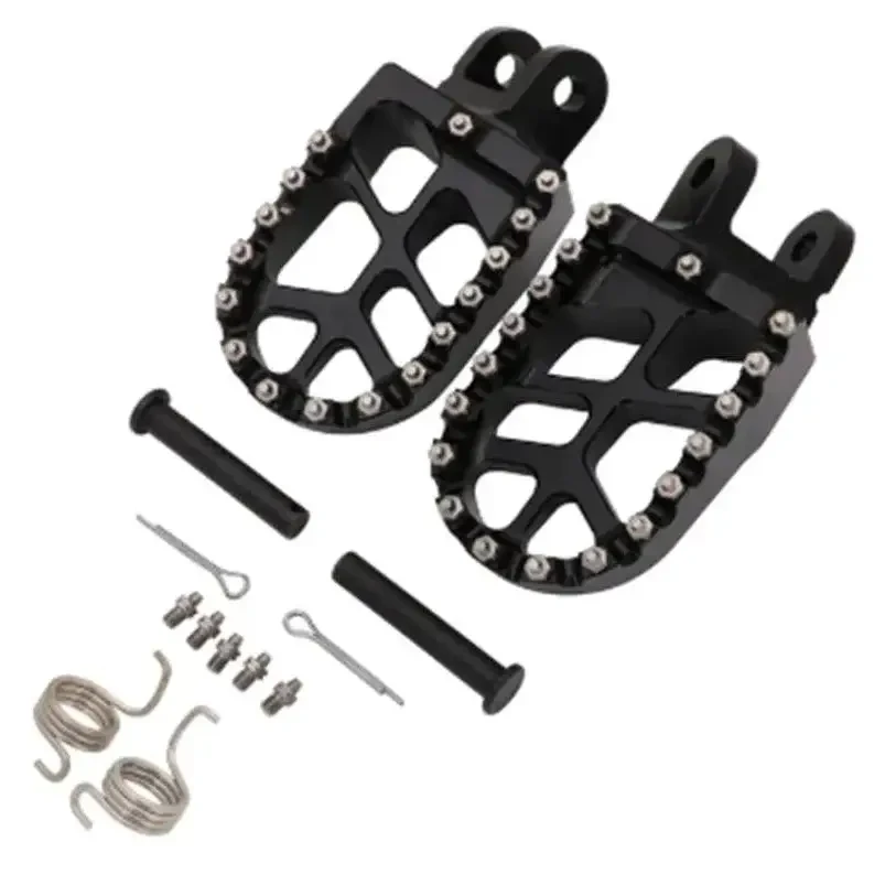 This product features premium CNC machined and anodized wide platform foot pegs designed for superior performance and rider comfort. Crafted from durable aluminum, these foot pegs provide exceptional strength and a lightweight design. The aggressive studded surface ensures maximum grip and control in all riding conditions, preventing foot slippage. The open design facilitates mud and debris shedding, maintaining consistent traction. This complete kit includes all necessary installation hardware: pins, springs, and bolts. Available in a striking anodized finish, these foot pegs enhance the aesthetic appeal of your motorcycle. They are engineered for a perfect fit on specific Honda and Kawasaki models, including CR80R/RB 1996-2002, CR85R/RB 2003-2007, XR250R 1996-2004, XR400R 1996-2004, XR600R 1989-2000, XR650L 1992-2019, XR650R 2000-2007, CRF1000L 2016-2017, CRF1000L DTC 2016-2017, KLX250R 1994-1996, KLX250 2006-2019, KLX250S 2009-2014, KLX250SF 2009-2010, KLX300R 1997-2007, KLX650 1993-1996, KLX650R 1996, and KLR650 1987-2007. Upgrade your dirt bike or adventure motorcycle with these high-performance footrests for improved stability and a confident ride.