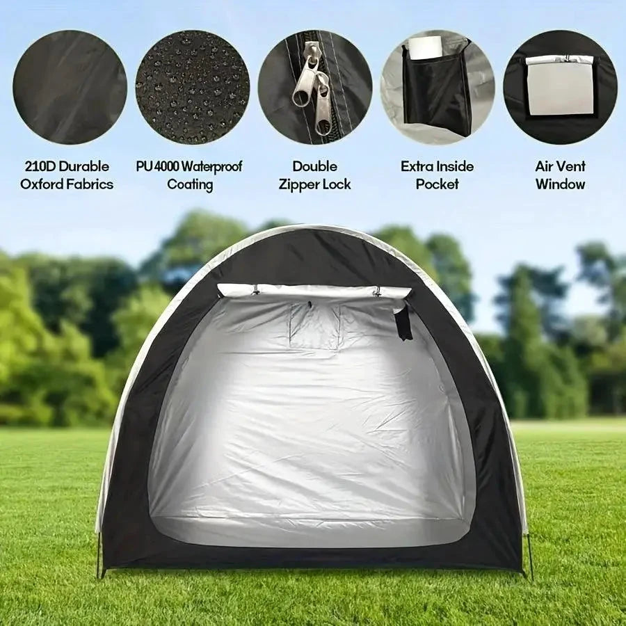 This versatile outdoor storage solution provides robust protection for your equipment. The durable, weatherproof fabric construction ensures superior defense against the elements, including rain, sun, and dust. A sturdy frame establishes a stable and reliable structure for consistent performance. This spacious unit expertly accommodates 2-3 bicycles, 2 motorcycles, or 2 lawn mowers. It also offers ample space for various household and gardening tools, patio furniture, and ladders, maintaining an organized environment. The convenient front access panel secures with a full-length zipper, providing effortless entry and enhanced security. This outdoor storage shed measures 78 inches (198.12 cm) in length, 32 inches (81.28 cm) in width, and 65 inches (165.1 cm) in height. It delivers an excellent space-saving solution for patios, decks, garages, and backyards, ensuring your outdoor equipment storage is protected and accessible.