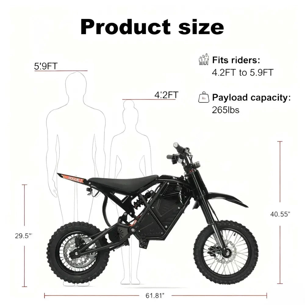 With a maximum speed of 37MPH, the electric dirt bike 2000W is perfect for tackling tough terrains while delivering a smooth and stable ride. Equipped with cutting-edge features, including a hydraulic disc brake system for superior stopping power, you can ride with confidence and control. Whether you're navigating steep hills or racing through trails, this bike is built to perform.
