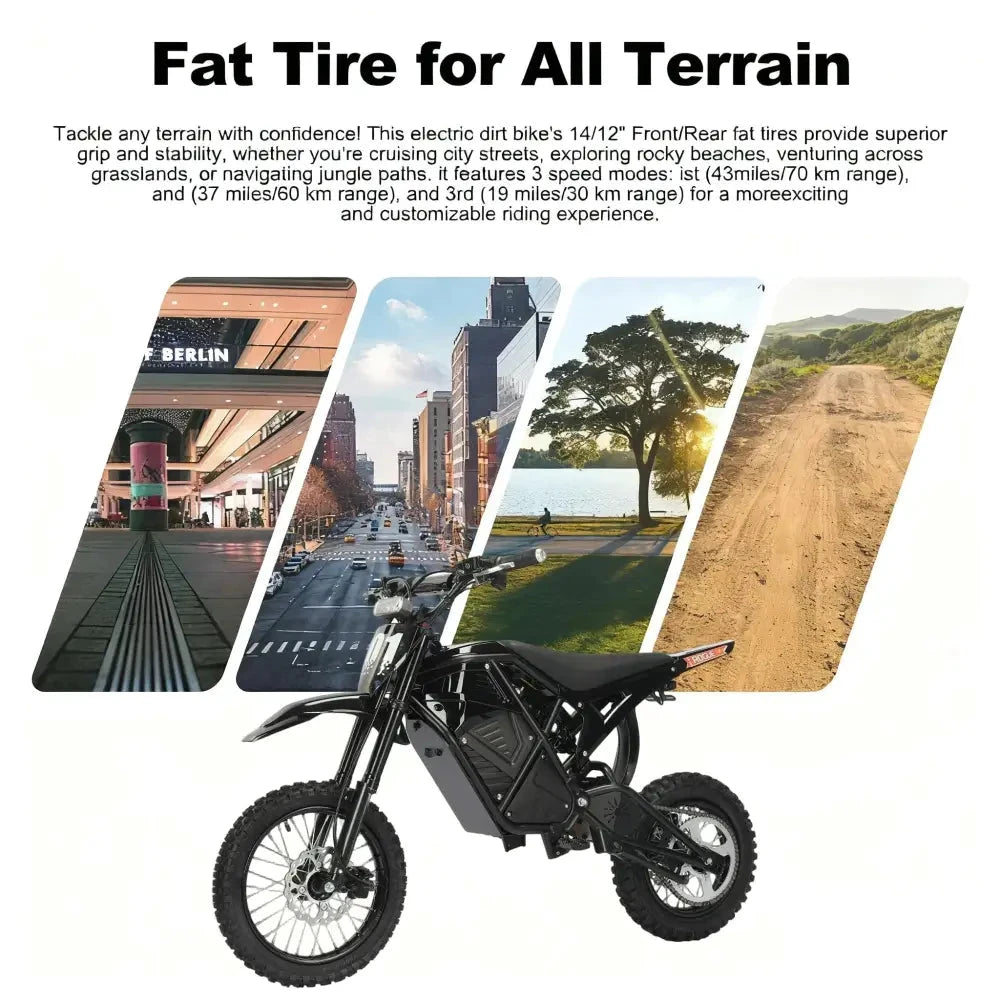 The electric dirt bike 2000W is also incredibly versatile. Whether you’re hitting the trails, exploring the countryside, or simply enjoying a ride down the local park, you’ll appreciate its power and agility. Its lightweight design offers maneuverability that lets you easily navigate tight corners and obstacles.