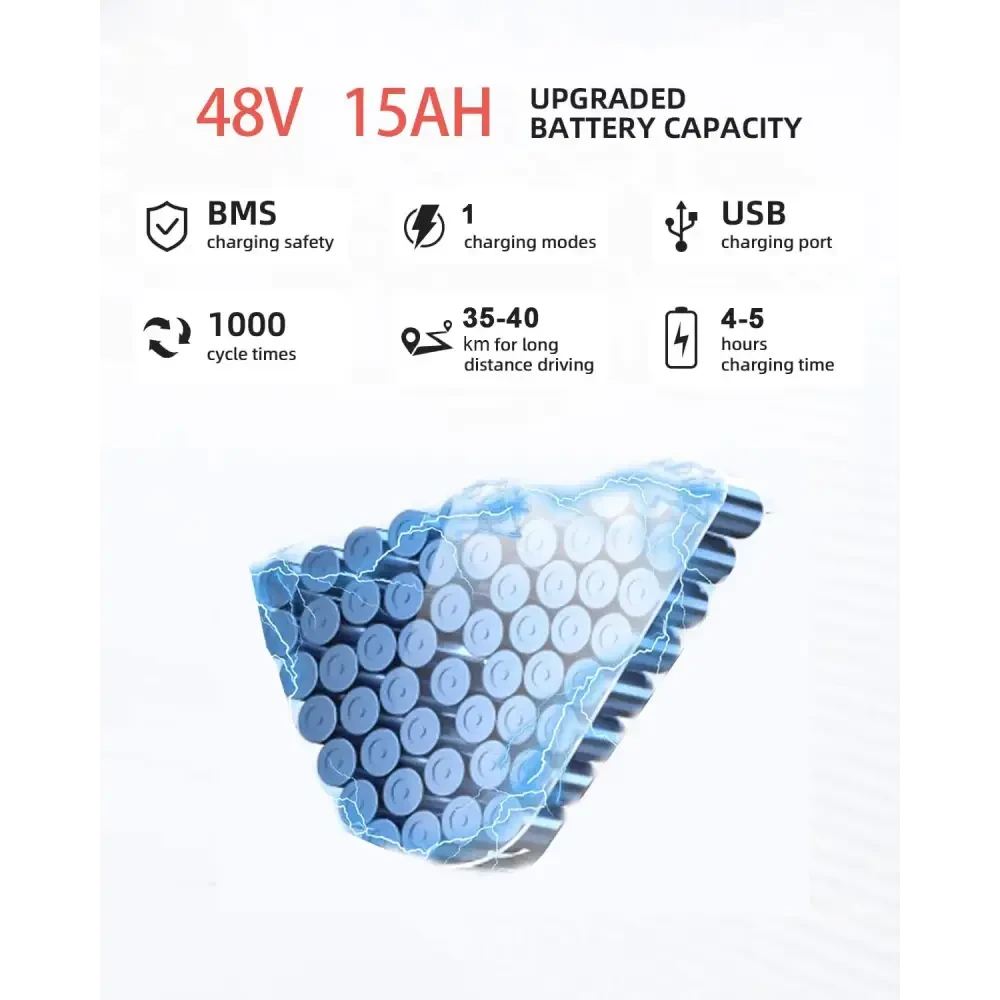 48V Lithium Battery: Offers long-lasting power that supports trips of extensive distances.