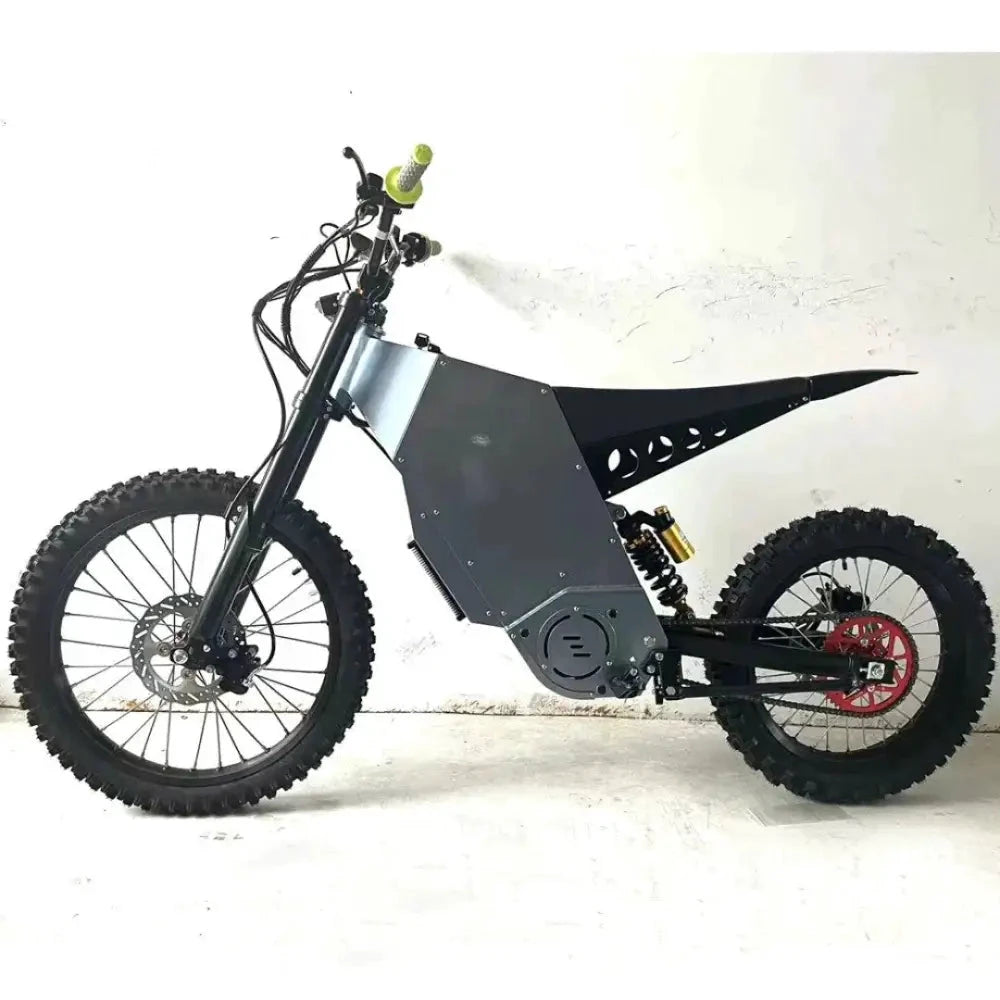 Black and gold electric dirt bike with a rugged, off-road design.